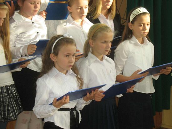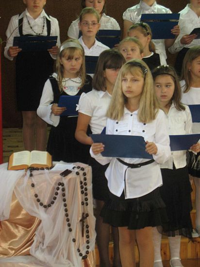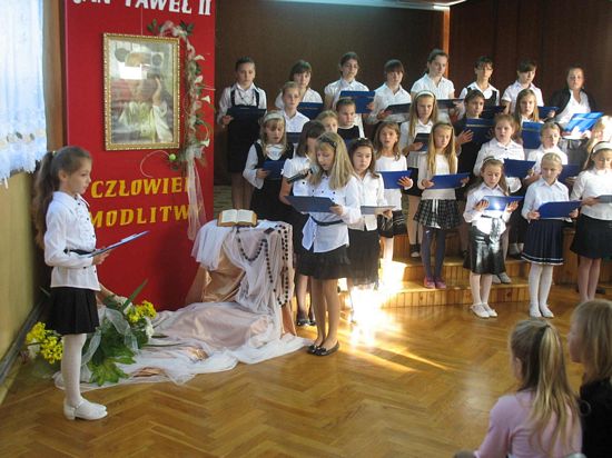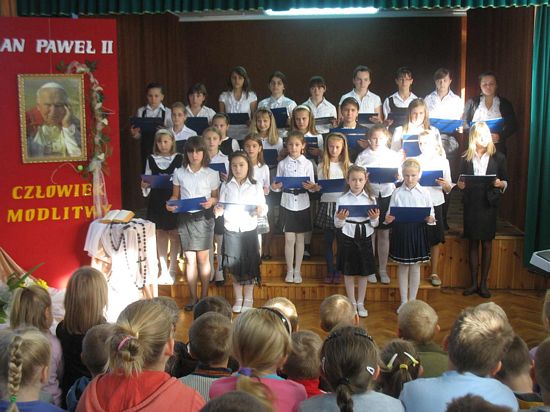 W kalendarz uroczystości naszej szkoły na stałe wpisały się obchody Dnia Papieskiego, przebiegające w tym roku pod hasłem „Jan Paweł II - człowiek modlitwy”. Nauczanie błogosławionego już Ojca Świętego Jana Pawła II, zaduma nad jego charyzmatycznym i przepełnionym nieustanną modlitwą życiem oraz refleksje dotyczące modlitwy każdego z nas wypełniły występ scholi (w liczbie 33. dziewczynek z naszej szkoły i absolwentek), która pod kierunkiem nauczycieli p. Ireny Klich i p. Waldemara Szloska przygotowała okolicznościowy montaż słowno-muzyczny. Po raz pierwszy zaprezentowała go w niedzielę, 9 października w kościele parafialnym podczas dwóch Mszy Świętych, a kolejny występ miał miejsce 12 października w szkole. Stosowną dekorację przygotował miejscowy oddział Akcji Katolickiej.