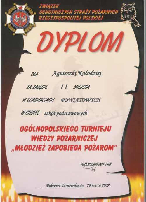 Miło nam poinformować, że uczennica naszej szkoły Agnieszka Kołodziej zajęła II miejsce w powiatowych eliminacjach w grupie szkół podstawowych Ogólnopolskiego Turnieju Wiedzy Pożarniczej „Młodzież zapobiega pożarom”.