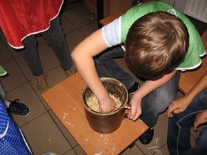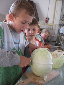 Zdobyte informacje wykorzystali w praktycznym działaniu. Z zapałem szatkowali kapustę. Następnie przyprawiali ją według poznanej receptury. Z kolei mocno tłoczyli zszatkowaną kapustę w glinianym garncu, używając do tego rąk (a nie nóg!). Na koniec docisnęli ją ciężkim kamieniem. W tak zabezpieczonym garncu kapusta poleży kilka miesięcy, aż będzie gotowa do spożycia.
